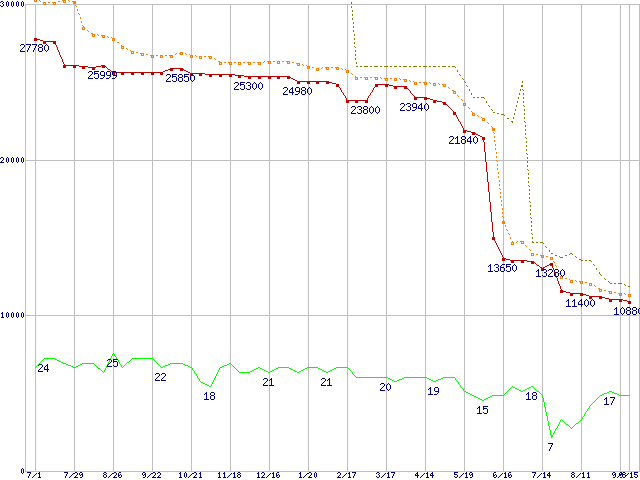 | Athlon 64 3500+ (2.2GHz,L2 512KB,Socket 939)の価格推移 | | | (2005年7月1日~2006年9月15日) |