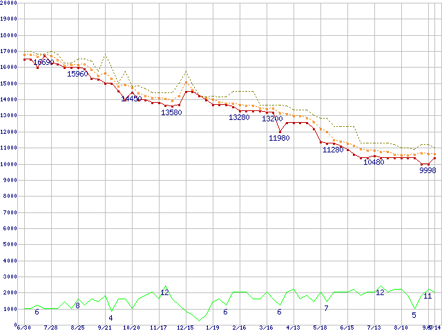 ※このグラフは過去のデータも税率5%相当に調整した税込み相当額のグラフです。 税率変更や、総額表示方式導入(2004年4月)の影響は除いています。 | | | ●凡例 | 最安値 (点線部は販売店未確認 または未調査) | 平均値 | 最高値 | ショップ数 |
