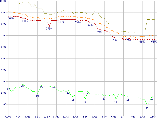 ※このグラフは過去のデータも税率5%相当に調整した税込み相当額のグラフです。 税率変更や、総額表示方式導入(2004年4月)の影響は除いています。 | | | ●凡例 | 最安値 (点線部は販売店未確認 または未調査) | 平均値 | 最高値 | ショップ数 |