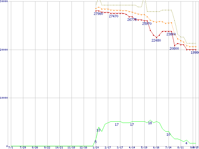 ※このグラフは過去のデータも税率5%相当に調整した税込み相当額のグラフです。 税率変更や、総額表示方式導入(2004年4月)の影響は除いています。 | | | ●凡例 | 最安値 (点線部は販売店未確認 または未調査) | 平均値 | 最高値 | ショップ数 |