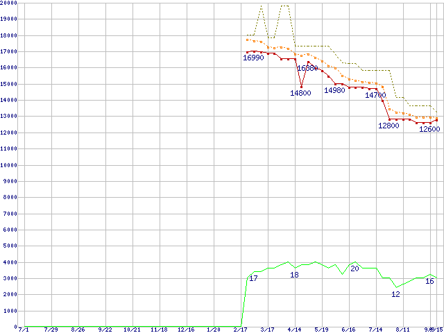 ※このグラフは過去のデータも税率5%相当に調整した税込み相当額のグラフです。 税率変更や、総額表示方式導入(2004年4月)の影響は除いています。 | | | ●凡例 | 最安値 (点線部は販売店未確認 または未調査) | 平均値 | 最高値 | ショップ数 |