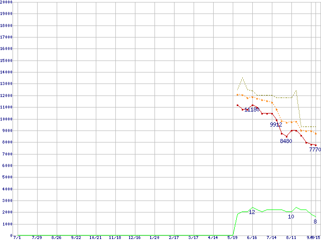 | Sempron 3400+ (1.8GHz,L2 256KB)の価格推移 | | | (2005年7月1日~2006年9月15日) |