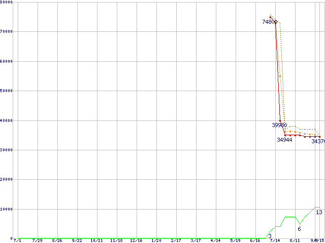 | Athlon 64 X2 4600+ (2.4GHz,L2 512KB×2,TDP65W)の価格推移 | | | (2005年7月1日~2006年9月15日) |
