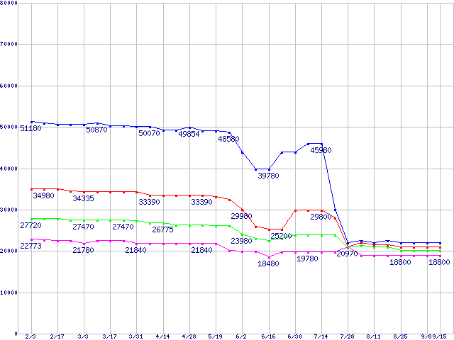 | LGA 775 (FSB 800MHz,L2 2MB,Hyper-Threading,EM64T対応)の最安値推移 | | | (2006年2月3日~2006年9月15日) |
