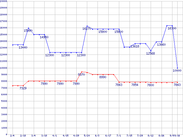 | PC3200(DDR400) DDR SDRAM DIMM ECC対応 Registeredタイプの最安値推移 | | | (2006年2月4日~2006年9月16日) |