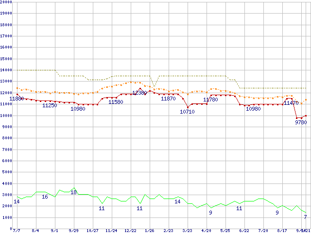 ※このグラフは過去のデータも税率5%相当に調整した税込み相当額のグラフです。 税率変更や、総額表示方式導入(2004年4月)の影響は除いています。 | | | ●凡例 | 最安値 (点線部は販売店未確認 または未調査) | 平均値 | 最高値 | ショップ数 |