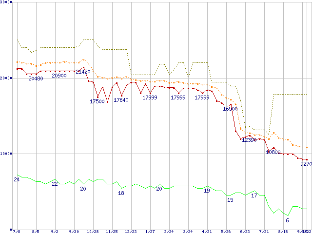 ※このグラフは過去のデータも税率5%相当に調整した税込み相当額のグラフです。 税率変更や、総額表示方式導入(2004年4月)の影響は除いています。 | | | ●凡例 | 最安値 (点線部は販売店未確認 または未調査) | 平均値 | 最高値 | ショップ数 |