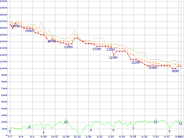 ※このグラフは過去のデータも税率5%相当に調整した税込み相当額のグラフです。 税率変更や、総額表示方式導入(2004年4月)の影響は除いています。 | | | ●凡例 | 最安値 (点線部は販売店未確認 または未調査) | 平均値 | 最高値 | ショップ数 |
