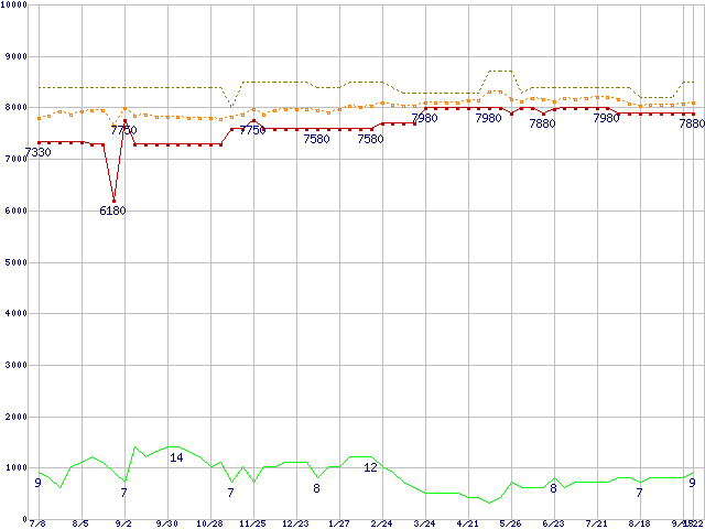 ※このグラフは過去のデータも税率5%相当に調整した税込み相当額のグラフです。 税率変更や、総額表示方式導入(2004年4月)の影響は除いています。 | | | ●凡例 | 最安値 (点線部は販売店未確認 または未調査) | 平均値 | 最高値 | ショップ数 |