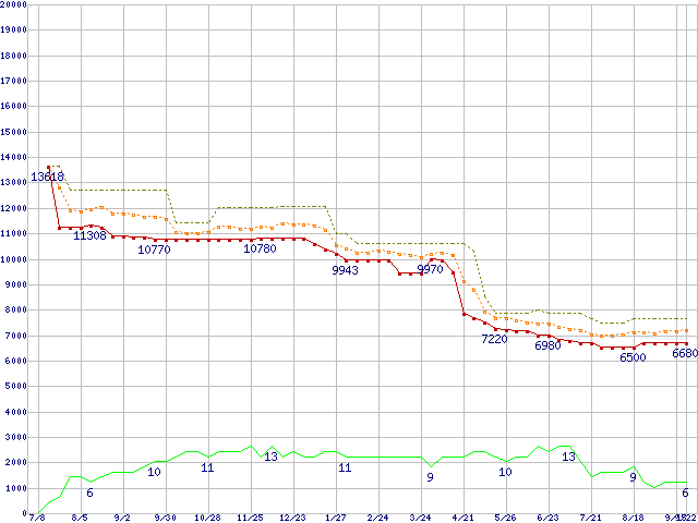 ※このグラフは過去のデータも税率5%相当に調整した税込み相当額のグラフです。 税率変更や、総額表示方式導入(2004年4月)の影響は除いています。 | | | ●凡例 | 最安値 (点線部は販売店未確認 または未調査) | 平均値 | 最高値 | ショップ数 |