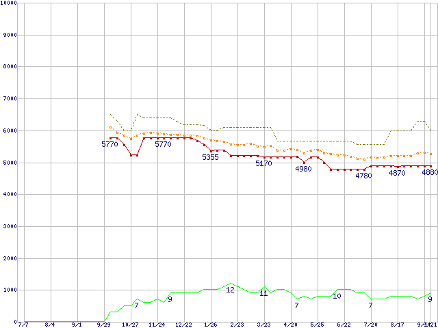 ※このグラフは過去のデータも税率5%相当に調整した税込み相当額のグラフです。 税率変更や、総額表示方式導入(2004年4月)の影響は除いています。 | | | ●凡例 | 最安値 (点線部は販売店未確認 または未調査) | 平均値 | 最高値 | ショップ数 |