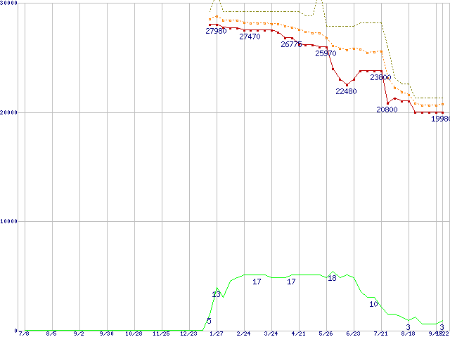※このグラフは過去のデータも税率5%相当に調整した税込み相当額のグラフです。 税率変更や、総額表示方式導入(2004年4月)の影響は除いています。 | | | ●凡例 | 最安値 (点線部は販売店未確認 または未調査) | 平均値 | 最高値 | ショップ数 |