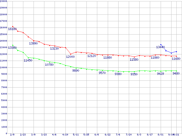 | MaXLine III (7200rpm,16MB,Serial ATA II,3Gbps)の最安値推移 | | | (2006年2月9日~2006年9月21日) |