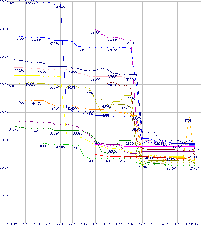 | CPU主要製品(最安値2万円~3万円未満)の最安値推移 | | | (2006年2月17日~2006年9月29日) |