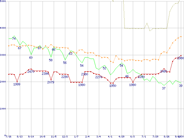 ※このグラフは過去のデータも税率5%相当に調整した税込み相当額のグラフです。 税率変更や、総額表示方式導入(2004年4月)の影響は除いています。 | | | ●凡例 | 最安値 (点線部は販売店未確認 または未調査) | 平均値 | 最高値 | ショップ数 |