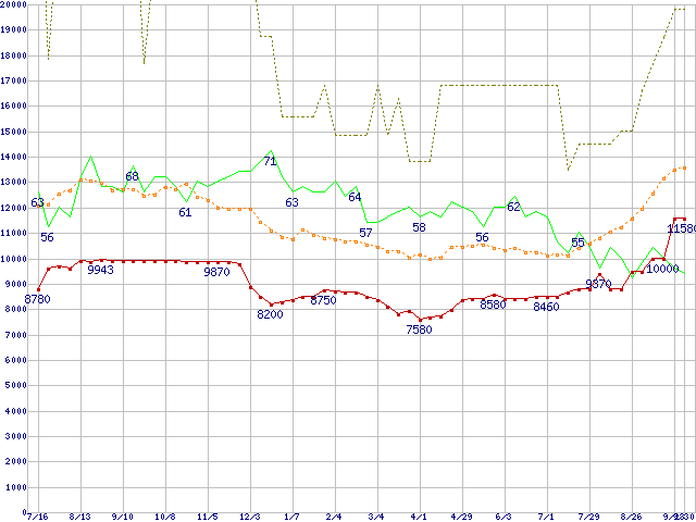※このグラフは過去のデータも税率5%相当に調整した税込み相当額のグラフです。 税率変更や、総額表示方式導入(2004年4月)の影響は除いています。 | | | ●凡例 | 最安値 (点線部は販売店未確認 または未調査) | 平均値 | 最高値 | ショップ数 |