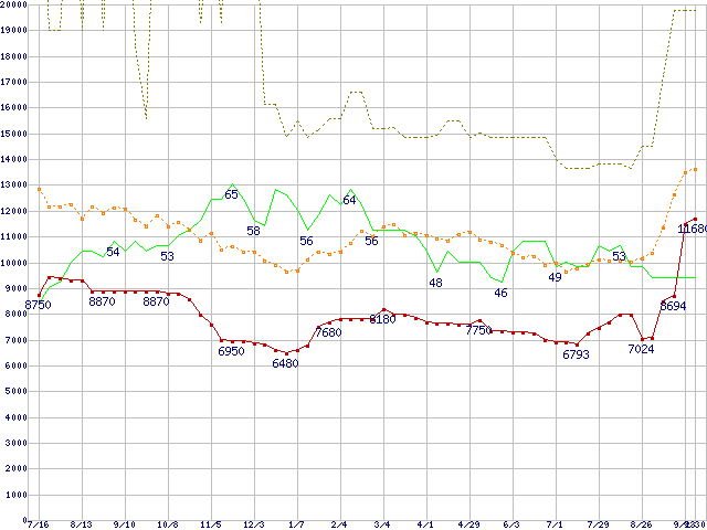 ※このグラフは過去のデータも税率5%相当に調整した税込み相当額のグラフです。 税率変更や、総額表示方式導入(2004年4月)の影響は除いています。 | | | ●凡例 | 最安値 (点線部は販売店未確認 または未調査) | 平均値 | 最高値 | ショップ数 |