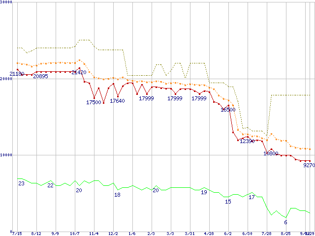 ※このグラフは過去のデータも税率5%相当に調整した税込み相当額のグラフです。 税率変更や、総額表示方式導入(2004年4月)の影響は除いています。 | | | ●凡例 | 最安値 (点線部は販売店未確認 または未調査) | 平均値 | 最高値 | ショップ数 |