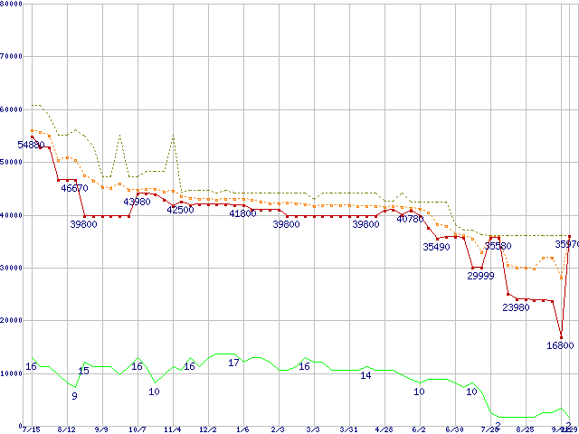 ※このグラフは過去のデータも税率5%相当に調整した税込み相当額のグラフです。 税率変更や、総額表示方式導入(2004年4月)の影響は除いています。 | | | ●凡例 | 最安値 (点線部は販売店未確認 または未調査) | 平均値 | 最高値 | ショップ数 |