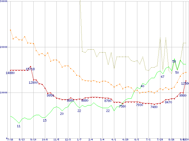 ※このグラフは過去のデータも税率5%相当に調整した税込み相当額のグラフです。 税率変更や、総額表示方式導入(2004年4月)の影響は除いています。 | | | ●凡例 | 最安値 (点線部は販売店未確認 または未調査) | 平均値 | 最高値 | ショップ数 |