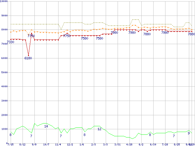 ※このグラフは過去のデータも税率5%相当に調整した税込み相当額のグラフです。 税率変更や、総額表示方式導入(2004年4月)の影響は除いています。 | | | ●凡例 | 最安値 (点線部は販売店未確認 または未調査) | 平均値 | 最高値 | ショップ数 |