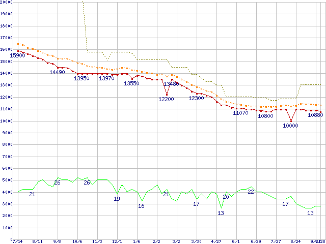 ※このグラフは過去のデータも税率5%相当に調整した税込み相当額のグラフです。 税率変更や、総額表示方式導入(2004年4月)の影響は除いています。 | | | ●凡例 | 最安値 (点線部は販売店未確認 または未調査) | 平均値 | 最高値 | ショップ数 |