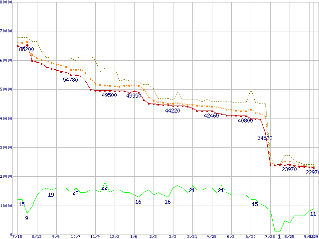 | Athlon 64 X2 4200+ (2.2GHz,L2 512KB×2,Socket 939)の価格推移 | | | (2005年7月15日~2006年9月29日) |