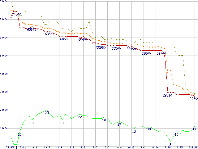 ※このグラフは過去のデータも税率5%相当に調整した税込み相当額のグラフです。 税率変更や、総額表示方式導入(2004年4月)の影響は除いています。 | | | ●凡例 | 最安値 (点線部は販売店未確認 または未調査) | 平均値 | 最高値 | ショップ数 |