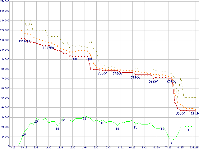 ※このグラフは過去のデータも税率5%相当に調整した税込み相当額のグラフです。 税率変更や、総額表示方式導入(2004年4月)の影響は除いています。 | | | ●凡例 | 最安値 (点線部は販売店未確認 または未調査) | 平均値 | 最高値 | ショップ数 |