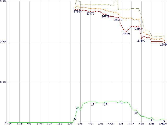 ※このグラフは過去のデータも税率5%相当に調整した税込み相当額のグラフです。 税率変更や、総額表示方式導入(2004年4月)の影響は除いています。 | | | ●凡例 | 最安値 (点線部は販売店未確認 または未調査) | 平均値 | 最高値 | ショップ数 |
