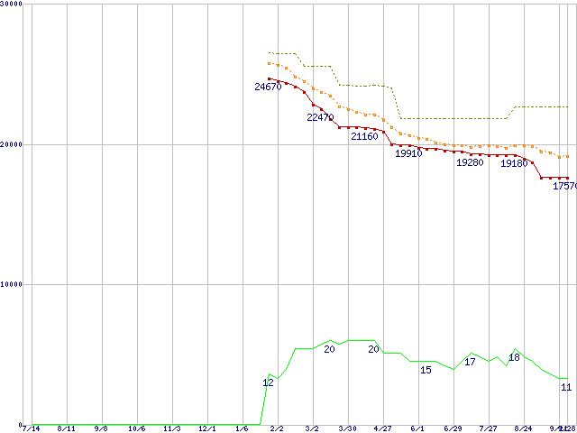 ※このグラフは過去のデータも税率5%相当に調整した税込み相当額のグラフです。 税率変更や、総額表示方式導入(2004年4月)の影響は除いています。 | | | ●凡例 | 最安値 (点線部は販売店未確認 または未調査) | 平均値 | 最高値 | ショップ数 |