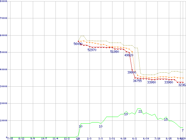 ※このグラフは過去のデータも税率5%相当に調整した税込み相当額のグラフです。 税率変更や、総額表示方式導入(2004年4月)の影響は除いています。 | | | ●凡例 | 最安値 (点線部は販売店未確認 または未調査) | 平均値 | 最高値 | ショップ数 |