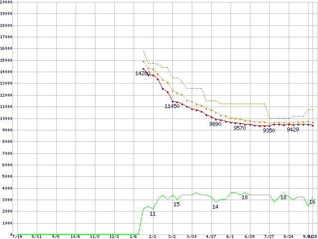※このグラフは過去のデータも税率5%相当に調整した税込み相当額のグラフです。 税率変更や、総額表示方式導入(2004年4月)の影響は除いています。 | | | ●凡例 | 最安値 (点線部は販売店未確認 または未調査) | 平均値 | 最高値 | ショップ数 |
