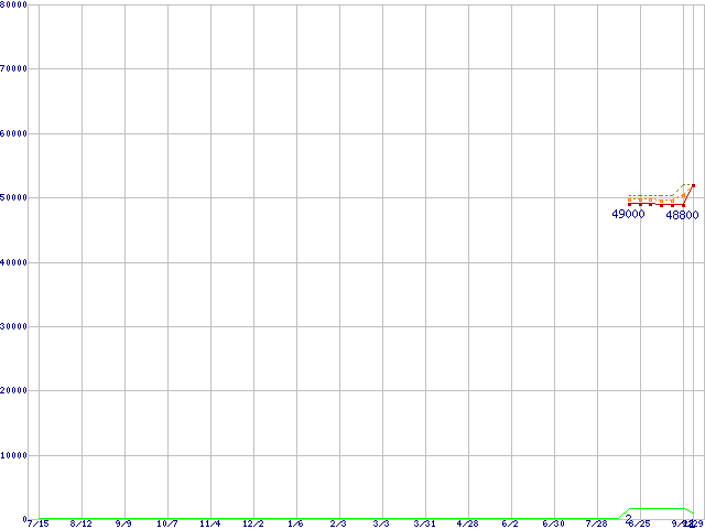 ※このグラフは過去のデータも税率5%相当に調整した税込み相当額のグラフです。 税率変更や、総額表示方式導入(2004年4月)の影響は除いています。 | | | ●凡例 | 最安値 (点線部は販売店未確認 または未調査) | 平均値 | 最高値 | ショップ数 |