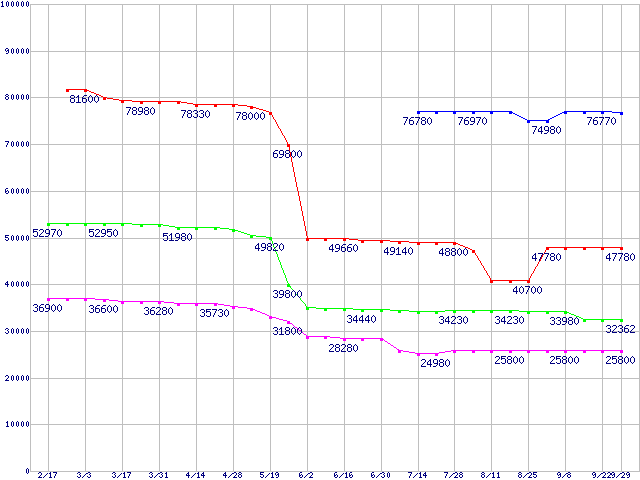 | Core Duo向けSocket 478 (FSB 667MHz,L2 2MB,Dual Core,VT対応)の最安値推移 | | | (2006年2月17日~2006年9月29日) |