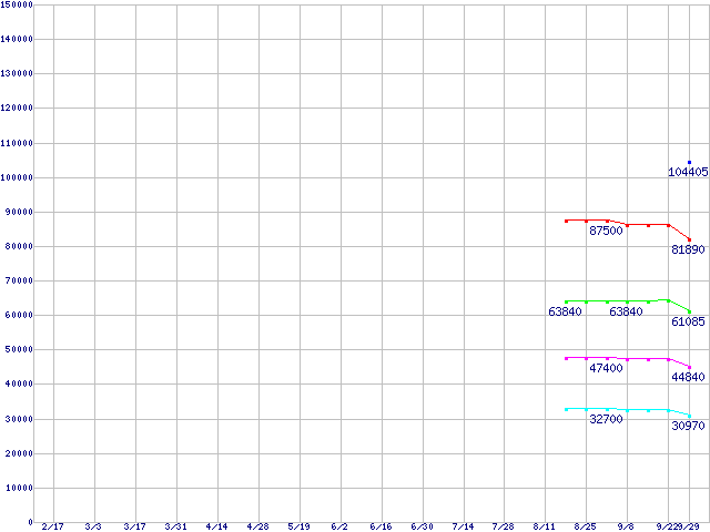 | Socket AM2 (FSB 1000MHz,L2 1MBx2,Dual Core,TDP 103W)の最安値推移 | | | (2006年2月17日~2006年9月29日) |