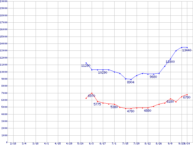 PC2-6400(DDR2-800) DDR2 SDRAM DIMMの最安値推移