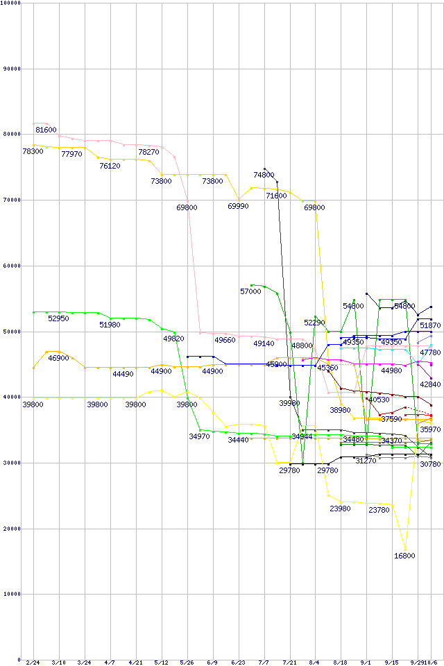 | CPU主要製品(最安値3万円~6万円未満)の最安値推移 | | | (2006年2月24日~2006年10月6日) |