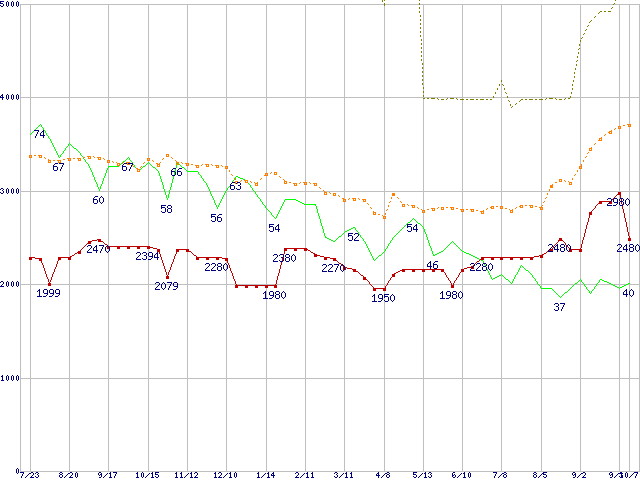 ※このグラフは過去のデータも税率5%相当に調整した税込み相当額のグラフです。 税率変更や、総額表示方式導入(2004年4月)の影響は除いています。 | | | ●凡例 | 最安値 (点線部は販売店未確認 または未調査) | 平均値 | 最高値 | ショップ数 |
