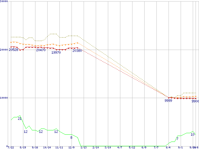 ※このグラフは過去のデータも税率5%相当に調整した税込み相当額のグラフです。 税率変更や、総額表示方式導入(2004年4月)の影響は除いています。 | | | ●凡例 | 最安値 (点線部は販売店未確認 または未調査) | 平均値 | 最高値 | ショップ数 |