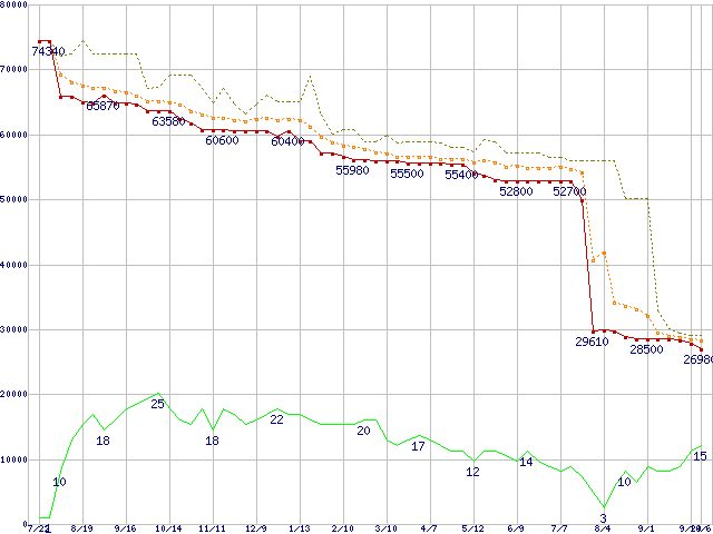 | Athlon 64 X2 4400+ (2.2GHz,L2 1MB×2,Socket 939)の価格推移 | | | (2005年7月22日~2006年10月6日) |