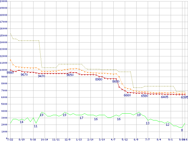 ※このグラフは過去のデータも税率5%相当に調整した税込み相当額のグラフです。 税率変更や、総額表示方式導入(2004年4月)の影響は除いています。 | | | ●凡例 | 最安値 (点線部は販売店未確認 または未調査) | 平均値 | 最高値 | ショップ数 |