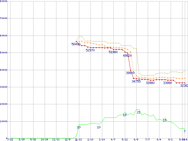 ※このグラフは過去のデータも税率5%相当に調整した税込み相当額のグラフです。 税率変更や、総額表示方式導入(2004年4月)の影響は除いています。 | | | ●凡例 | 最安値 (点線部は販売店未確認 または未調査) | 平均値 | 最高値 | ショップ数 |