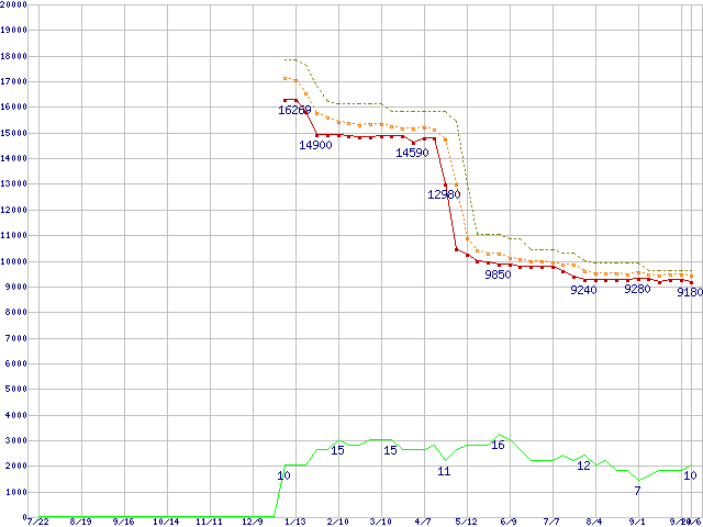 ※このグラフは過去のデータも税率5%相当に調整した税込み相当額のグラフです。 税率変更や、総額表示方式導入(2004年4月)の影響は除いています。 | | | ●凡例 | 最安値 (点線部は販売店未確認 または未調査) | 平均値 | 最高値 | ショップ数 |
