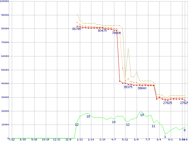 ※このグラフは過去のデータも税率5%相当に調整した税込み相当額のグラフです。 税率変更や、総額表示方式導入(2004年4月)の影響は除いています。 | | | ●凡例 | 最安値 (点線部は販売店未確認 または未調査) | 平均値 | 最高値 | ショップ数 |