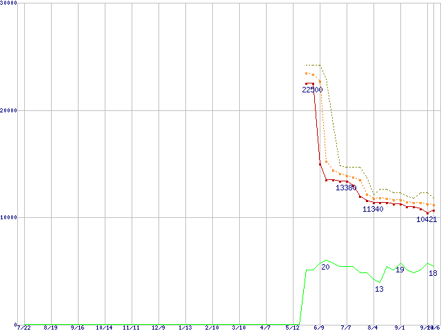 ※このグラフは過去のデータも税率5%相当に調整した税込み相当額のグラフです。 税率変更や、総額表示方式導入(2004年4月)の影響は除いています。 | | | ●凡例 | 最安値 (点線部は販売店未確認 または未調査) | 平均値 | 最高値 | ショップ数 |
