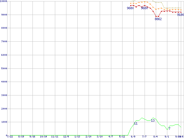 ※このグラフは過去のデータも税率5%相当に調整した税込み相当額のグラフです。 税率変更や、総額表示方式導入(2004年4月)の影響は除いています。 | | | ●凡例 | 最安値 (点線部は販売店未確認 または未調査) | 平均値 | 最高値 | ショップ数 |