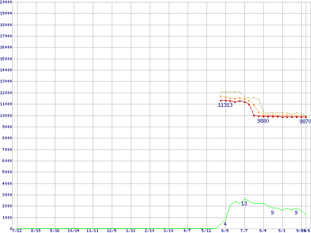 ※このグラフは過去のデータも税率5%相当に調整した税込み相当額のグラフです。 税率変更や、総額表示方式導入(2004年4月)の影響は除いています。 | | | ●凡例 | 最安値 (点線部は販売店未確認 または未調査) | 平均値 | 最高値 | ショップ数 |