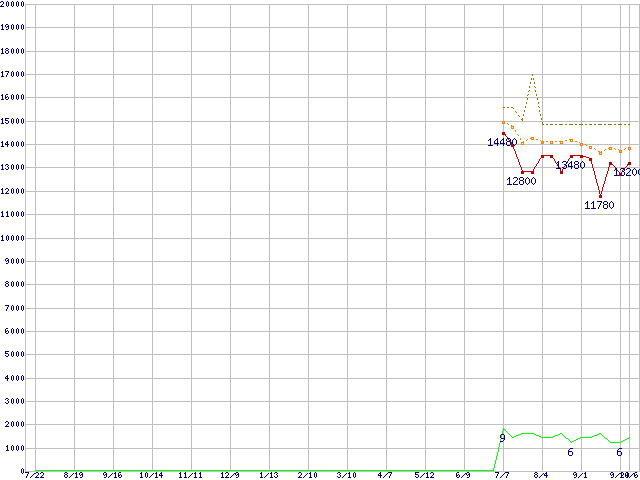 ※このグラフは過去のデータも税率5%相当に調整した税込み相当額のグラフです。 税率変更や、総額表示方式導入(2004年4月)の影響は除いています。 | | | ●凡例 | 最安値 (点線部は販売店未確認 または未調査) | 平均値 | 最高値 | ショップ数 |