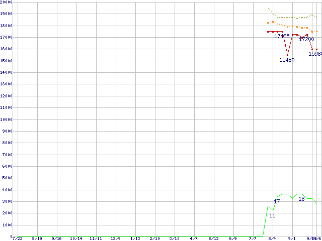 ※このグラフは過去のデータも税率5%相当に調整した税込み相当額のグラフです。 税率変更や、総額表示方式導入(2004年4月)の影響は除いています。 | | | ●凡例 | 最安値 (点線部は販売店未確認 または未調査) | 平均値 | 最高値 | ショップ数 |